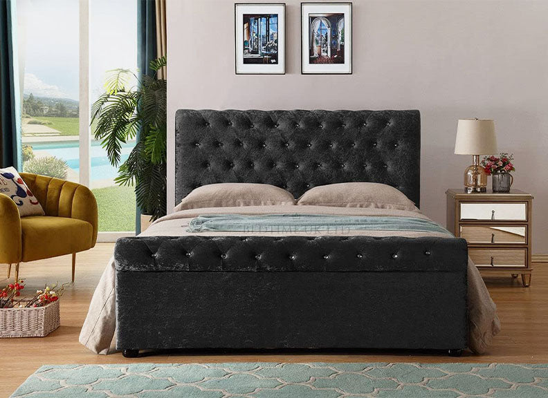 Our sleigh bed frame is available in five luxurious fabrics. Choose from Plush Velvet, Naples, Crushed Velvet, Coniston, and Chenille.